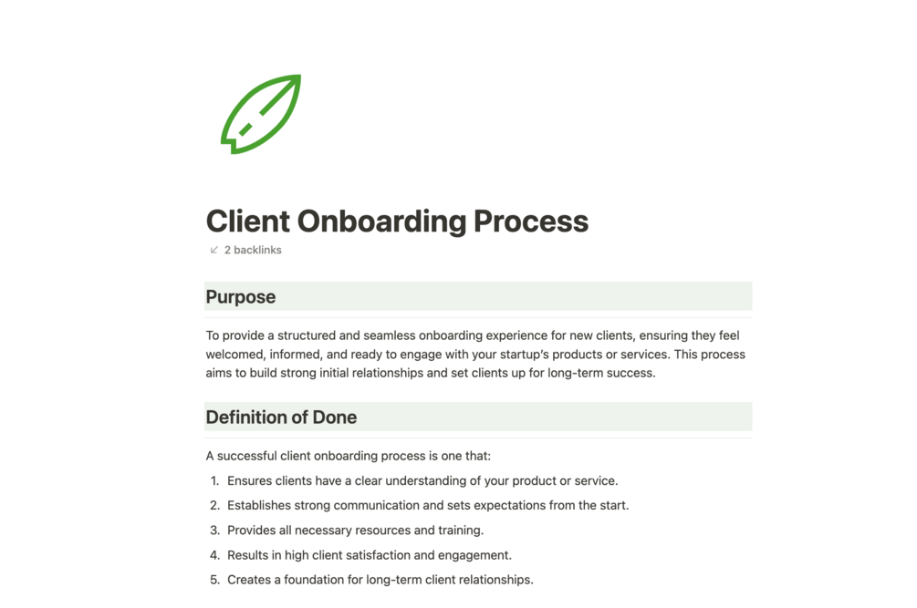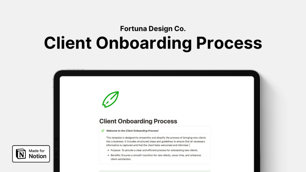 The Client Onboarding Process is designed to streamline and simplify the way your business brings new clients into the fold. It includes structured steps and guidelines to ensure that all necessary information is captured and that the client feels welcomed and informed.
