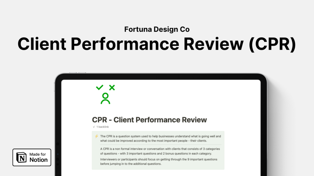 The Client Performance Review (CPR) template is designed to help businesses evaluate and improve their services based on client feedback. This structured interview system consists of three categories, each containing three important questions and two bonus questions, focusing on service effectiveness, communication, and value differentiation.
